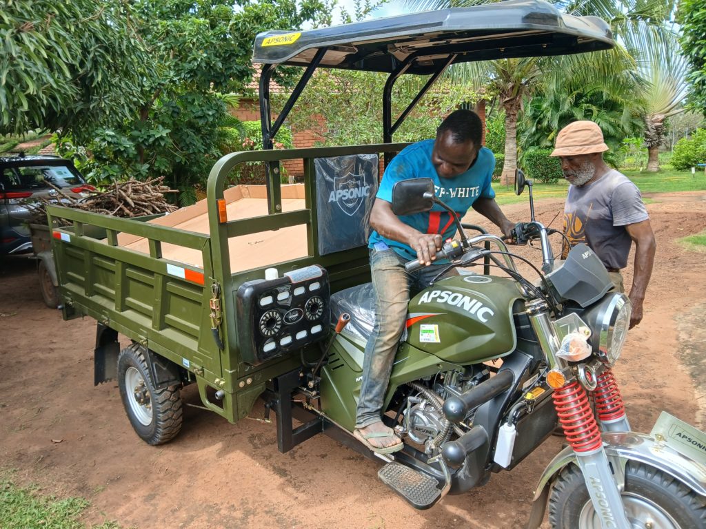 1. Comme nous vous l’avions annoncé, nous nous sommes équipés d’un  tricycle, Notre Land Rover de 25 ans  offerte par  une de nos adhérentes est  hors service et il est impossible de trouver maintenant de nouvelles pièces de rechange. Le plus souvent il fallait aller à pied à la ferme sur ces 4 km sous le soleil.. Cela nous évite beaucoup de peine et il est très maniable